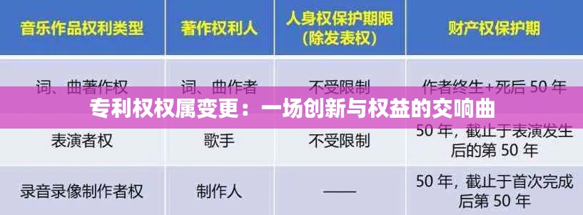 专利权权属变更,犹如一场创新与权益的交响曲,奏响了科技发展的动人旋律。它不仅是创新者智慧的变现途径,更是企业战略布局的重要手段。在未来的发展中,随着市场需求的不断变化和技术的不断进步,专利权权属变更将迎来更加广阔的舞台。